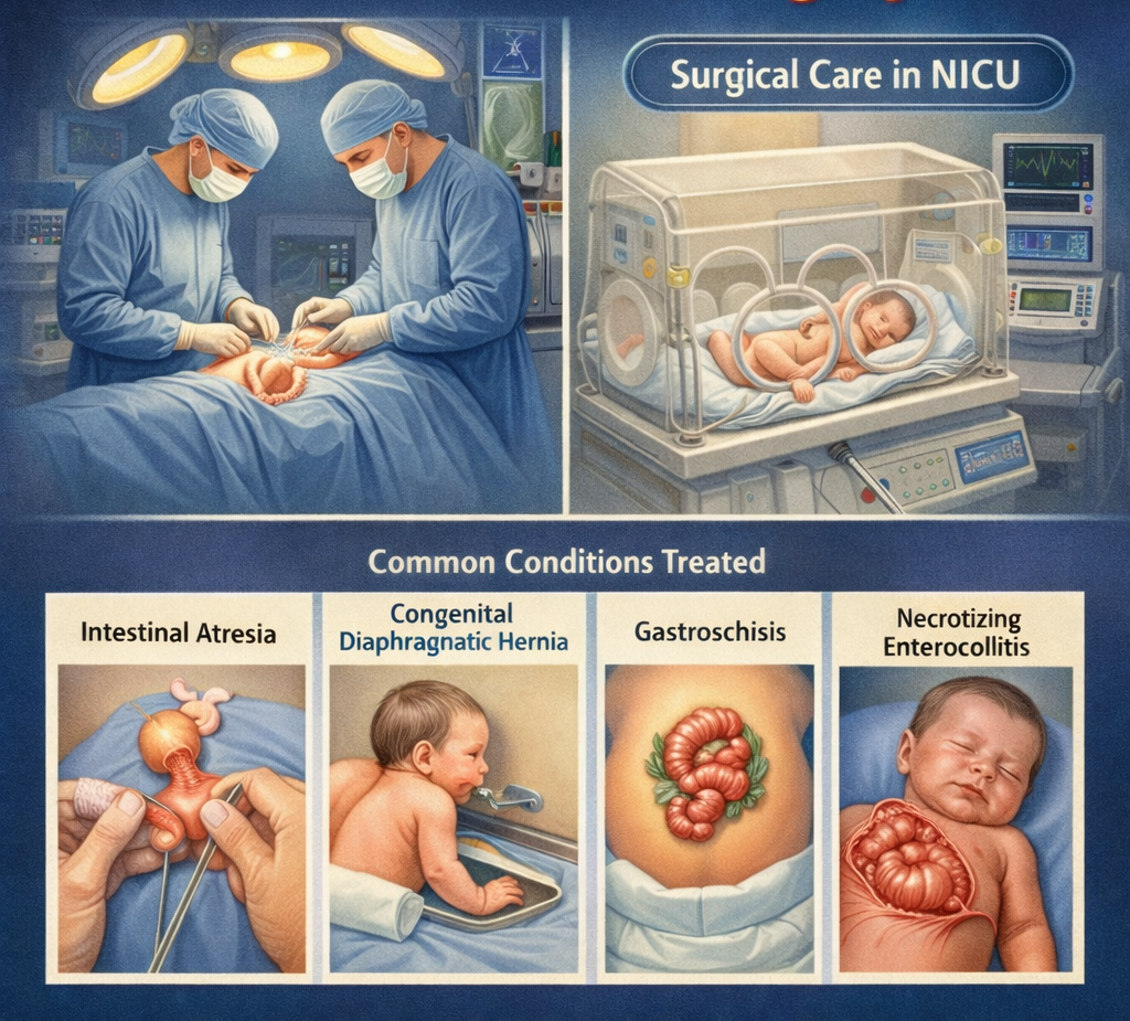 Newborns may be born with certain structural or functional abnormalities that require immediate surgical care. Early diagnosis helps in timely intervention.