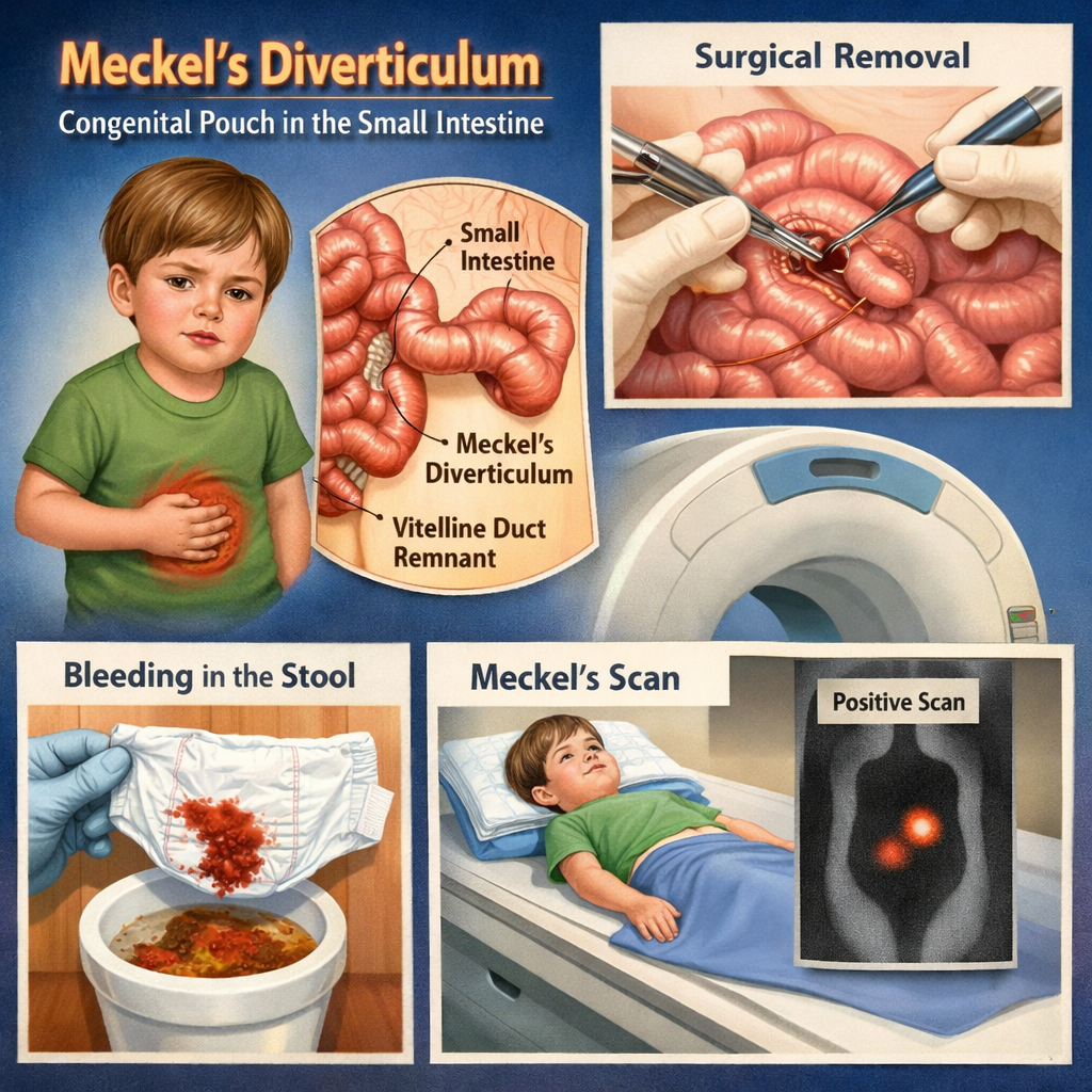 Meckel’s Diverticulum is a condition that develops before birth due to changes in the normal formation of the digestive tract. It is not caused by food habits, infections, or lifestyle factors. Early recognition of symptoms helps prevent complications and ensures timely treatment.